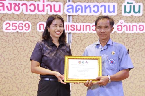 ในการนี้ รองผู้ว่าราชการจังหวัดน่าน ได้มอบเกียรติบัตรยกย่องเชิดชูทีม อสม.ดีเด่น ประจำปี 2569 จำนวน 11 ราย และทีมพี่เลี้ยงสนับสนุนดีเด่น จำนวน 11 ราย เพื่อสร้างขวัญกำลังใจในการปฏิบัติงานและเป็นแบบอย่างที่ดีในการพัฒนาสุขภาพของประชาชนในพื้นที่ต่อไป