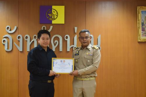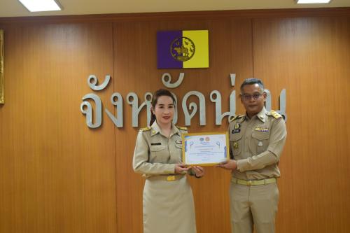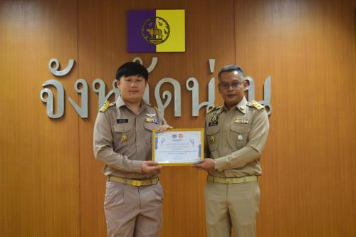 วันที่ 30 มีนาคม 2569 นายบรรจง ขุนเพชร รองผู้ว่าราชการจังหวัดน่าน เป็นประธานในพิธีมอบเกียรติบัตรบุคคลต้นแบบตามโครงการ “1 คน 1 งานเด่น” พัฒนาคน พัฒนางาน พช.น่าน สู่ยุคดิจิทัล 4.0 ประจำปี 2569 ให้แก่เจ้าหน้าที่พัฒนาชุมชนที่มีผลงานโดดเด่นจำนวน 13 ราย ณ ห้องประชุมเจ้าสุริยพงษ์ผริตเดช ชั้น 3 ศาลากลางจังหวัดน่าน เพื่อยกย่องเชิดชูเกียรติบุคลากรที่มีความมุ่งมั่นในการประยุกต์ใช้เทคโนโลยีสารสนเทศเพื่อพัฒนางานบริการประชาชนและการพัฒนาชุมชนให้มีประสิทธิภาพสอดรับกับนโยบายประเทศไทย 4.0